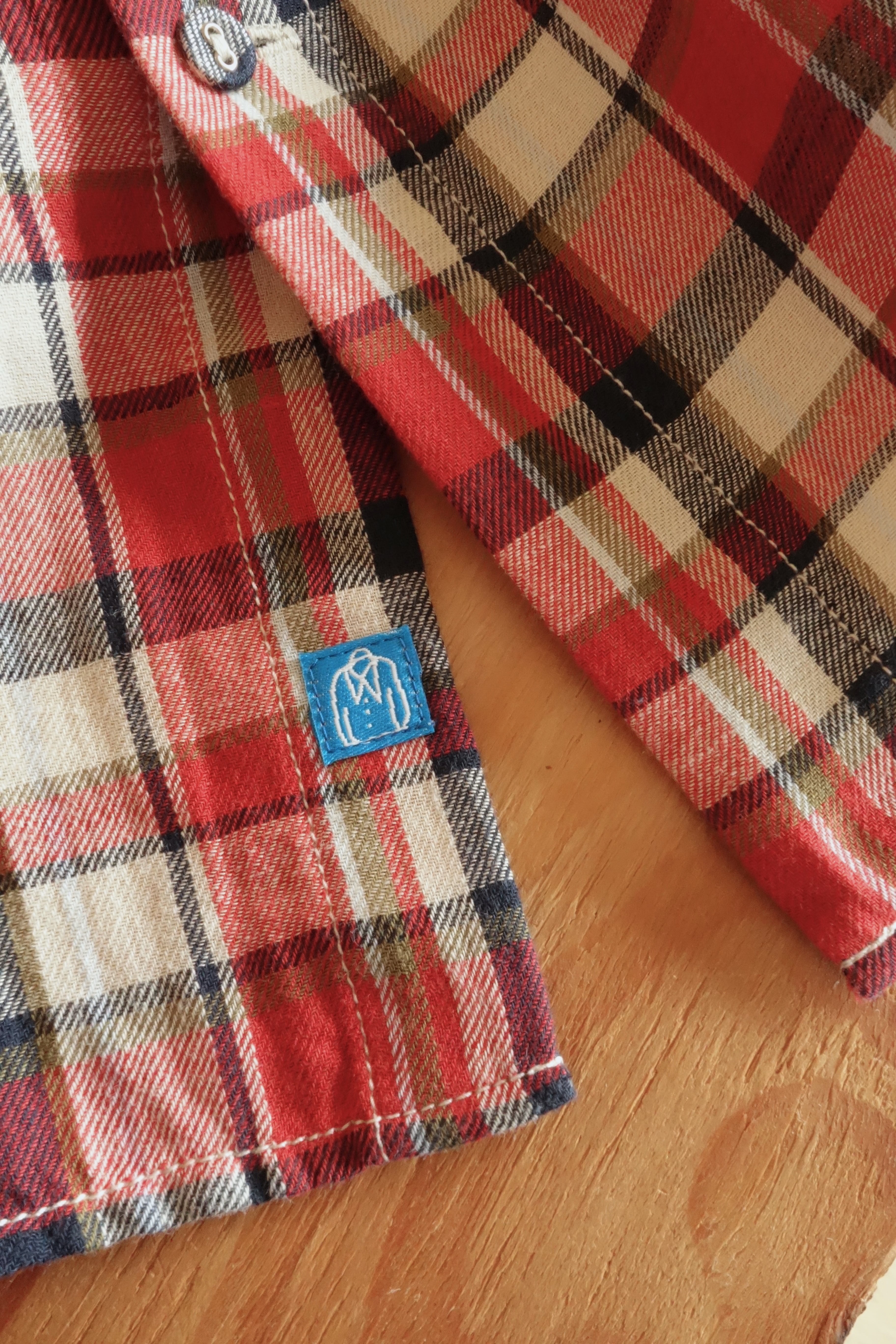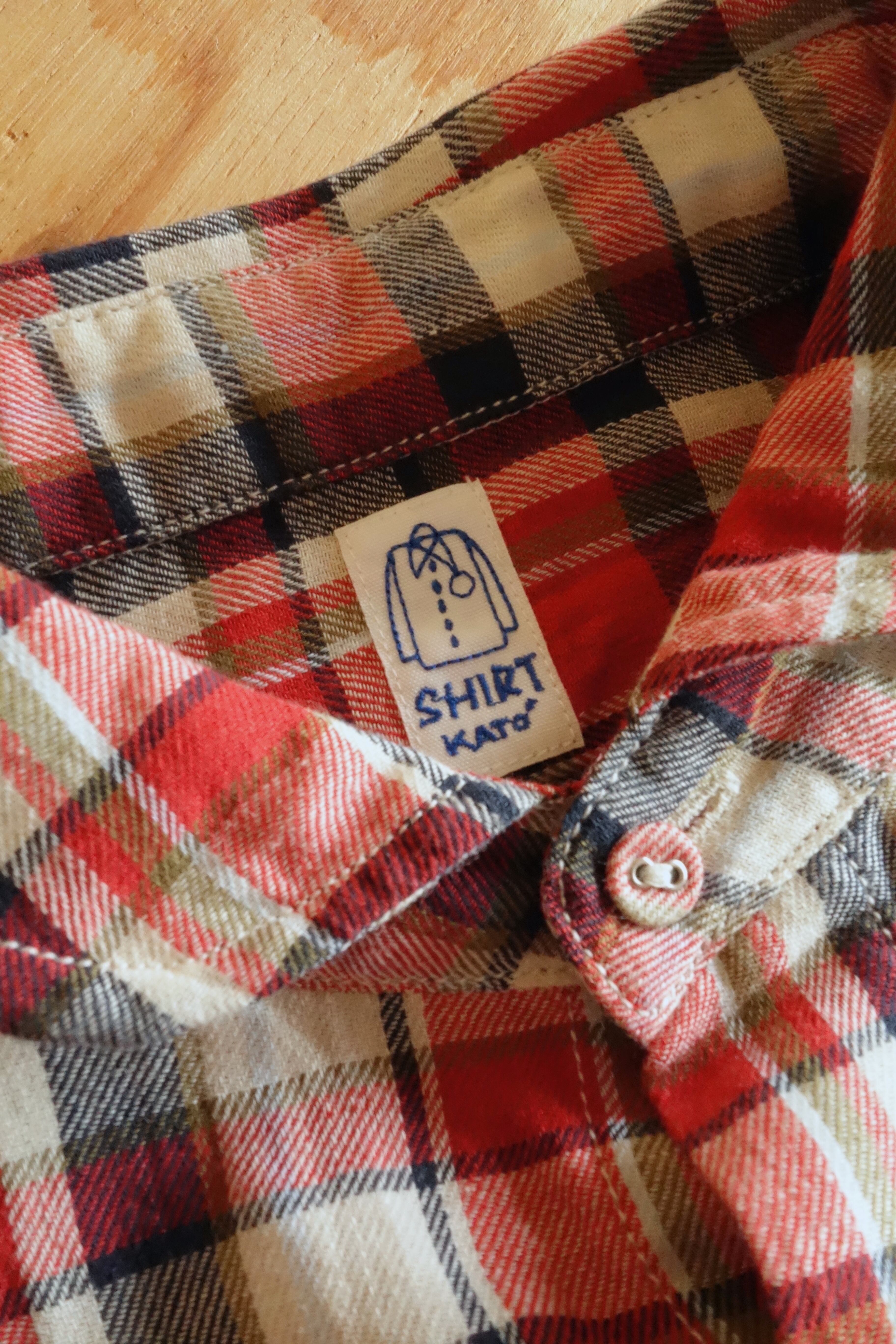 コットンリネンの甘織りのチェック生地でつくられた、柔らかさとシャリ感を備えた、非常に着心地の良い一枚。ランドカラーの襟とくるみボタンもポイントとなっております。