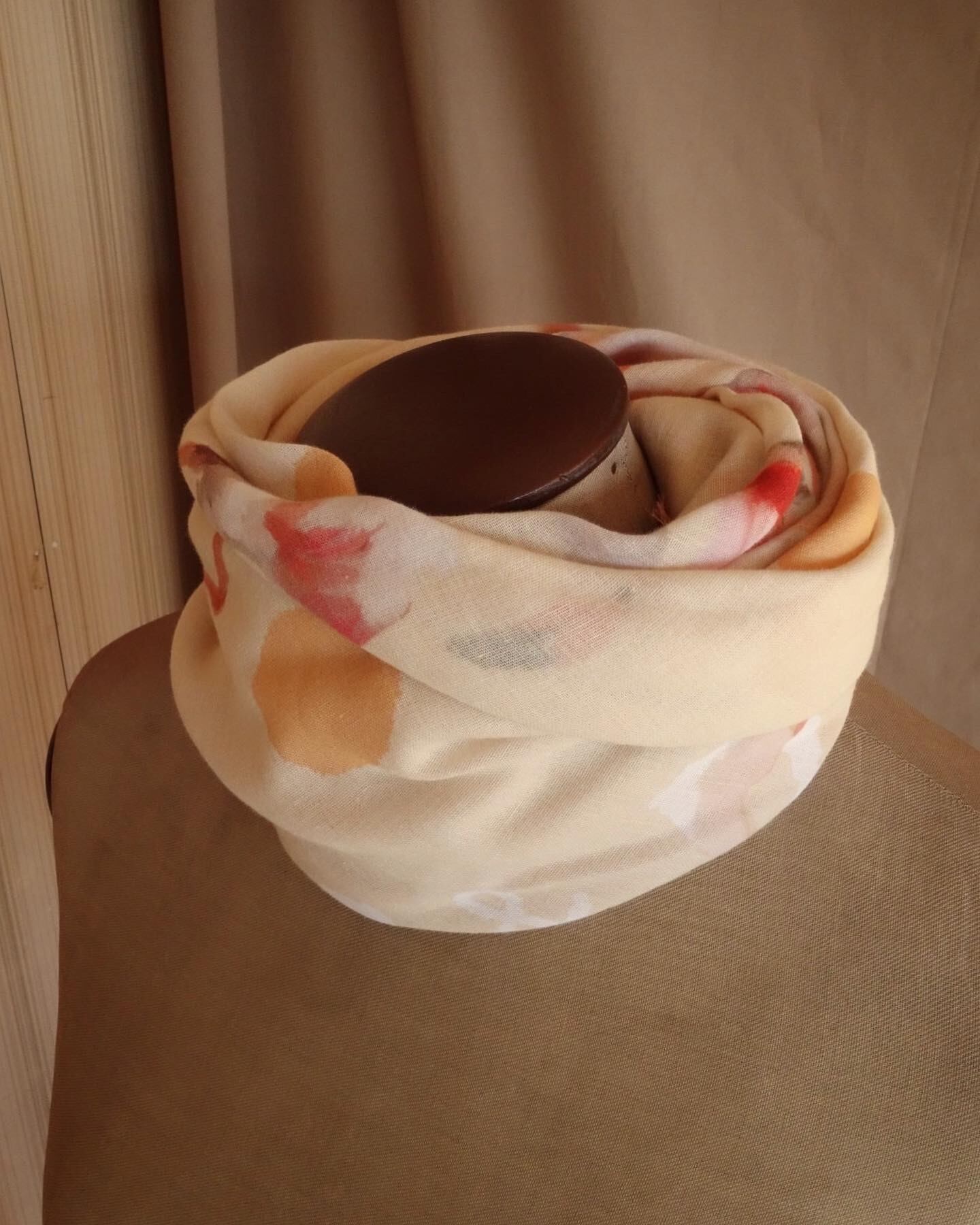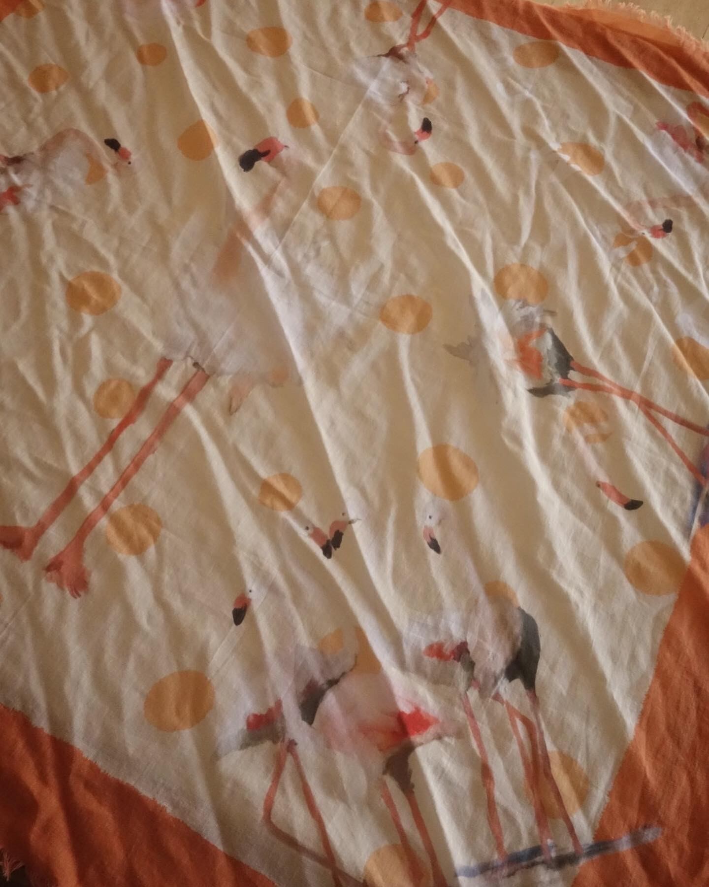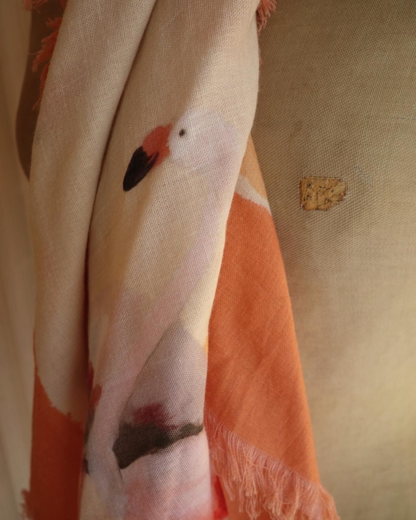 淡いカラーと水彩画の様なタッチなフラミンゴの表情とドットのプリント魅力的で、ガーゼの様な素材がふわりと首回りを優しく包んでくれます。