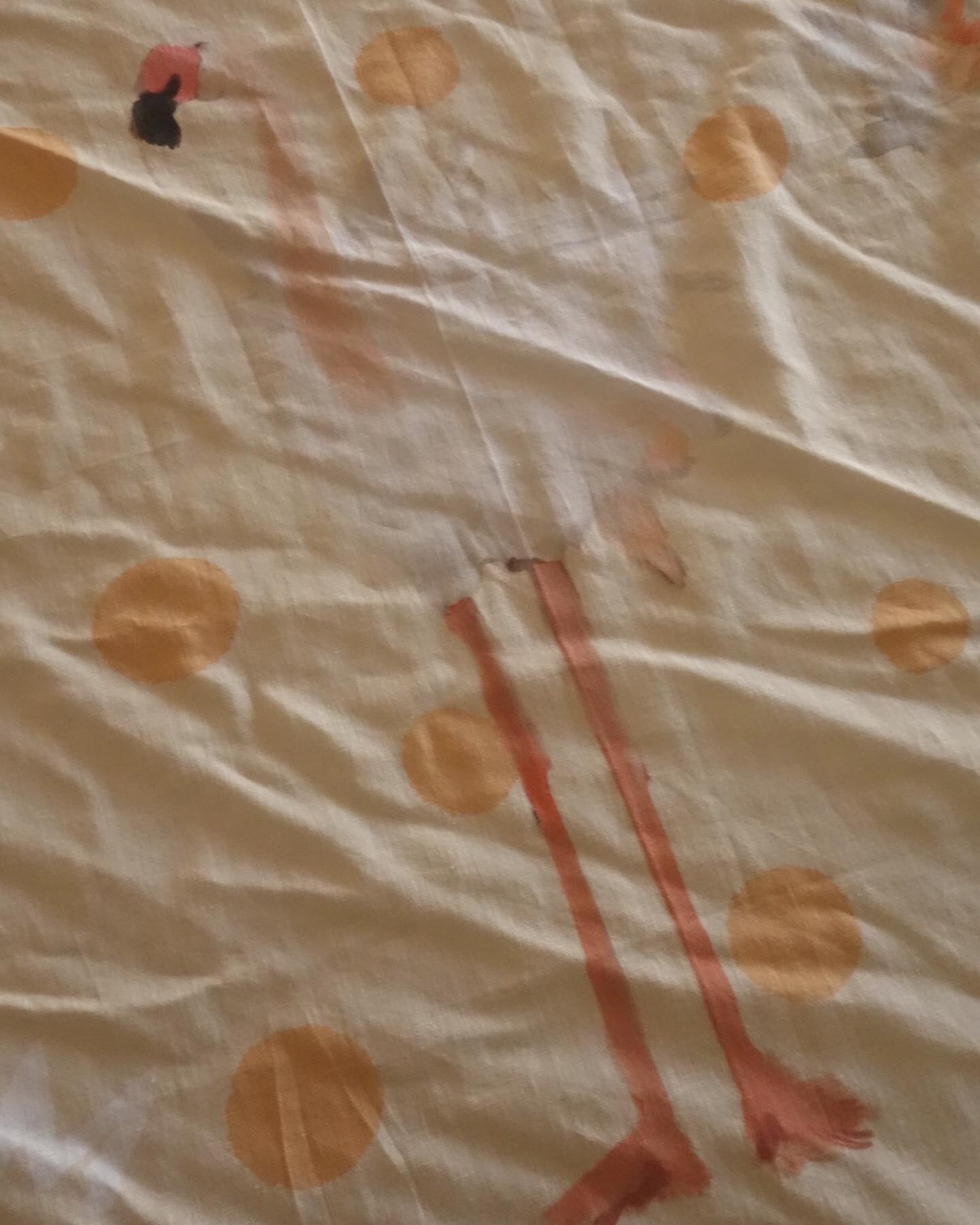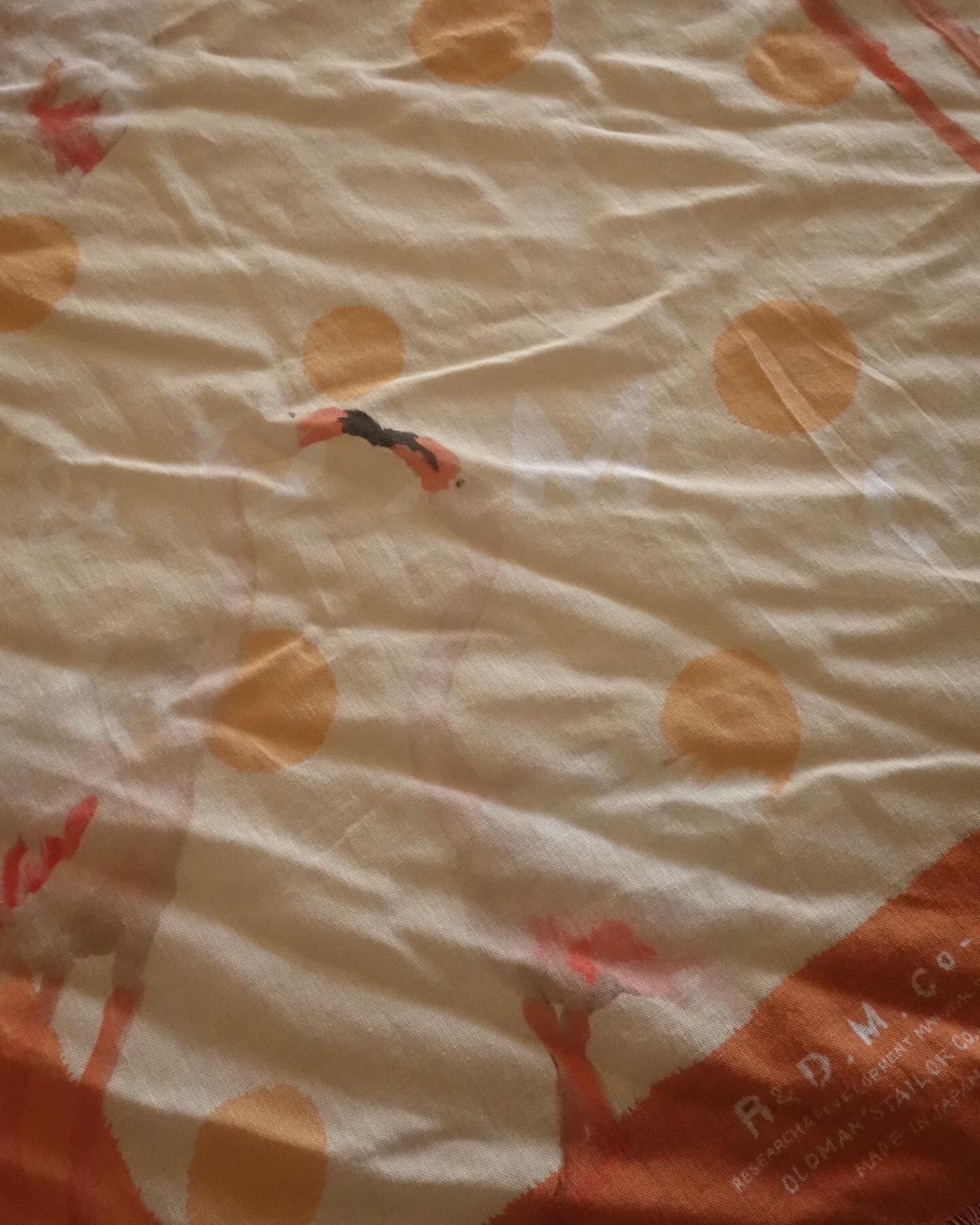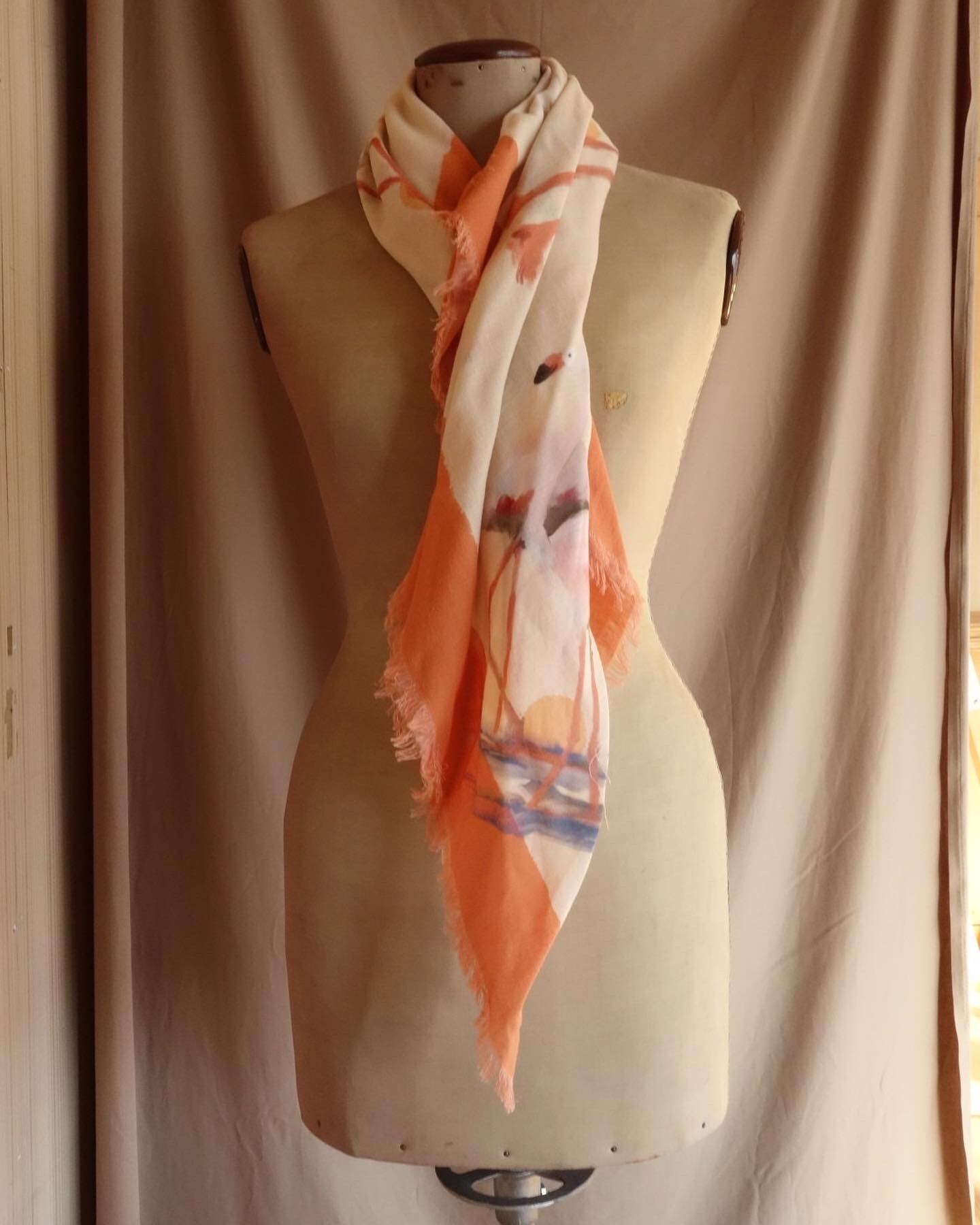 淡いカラーと水彩画の様なタッチなフラミンゴの表情とドットのプリント魅力的で、ガーゼの様な素材がふわりと首回りを優しく包んでくれます。