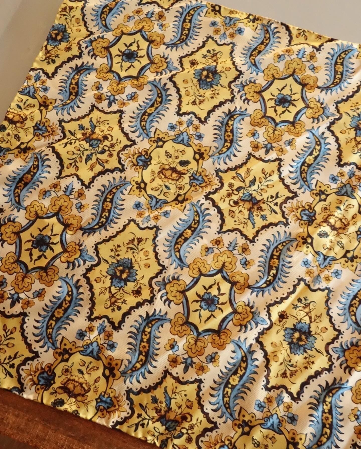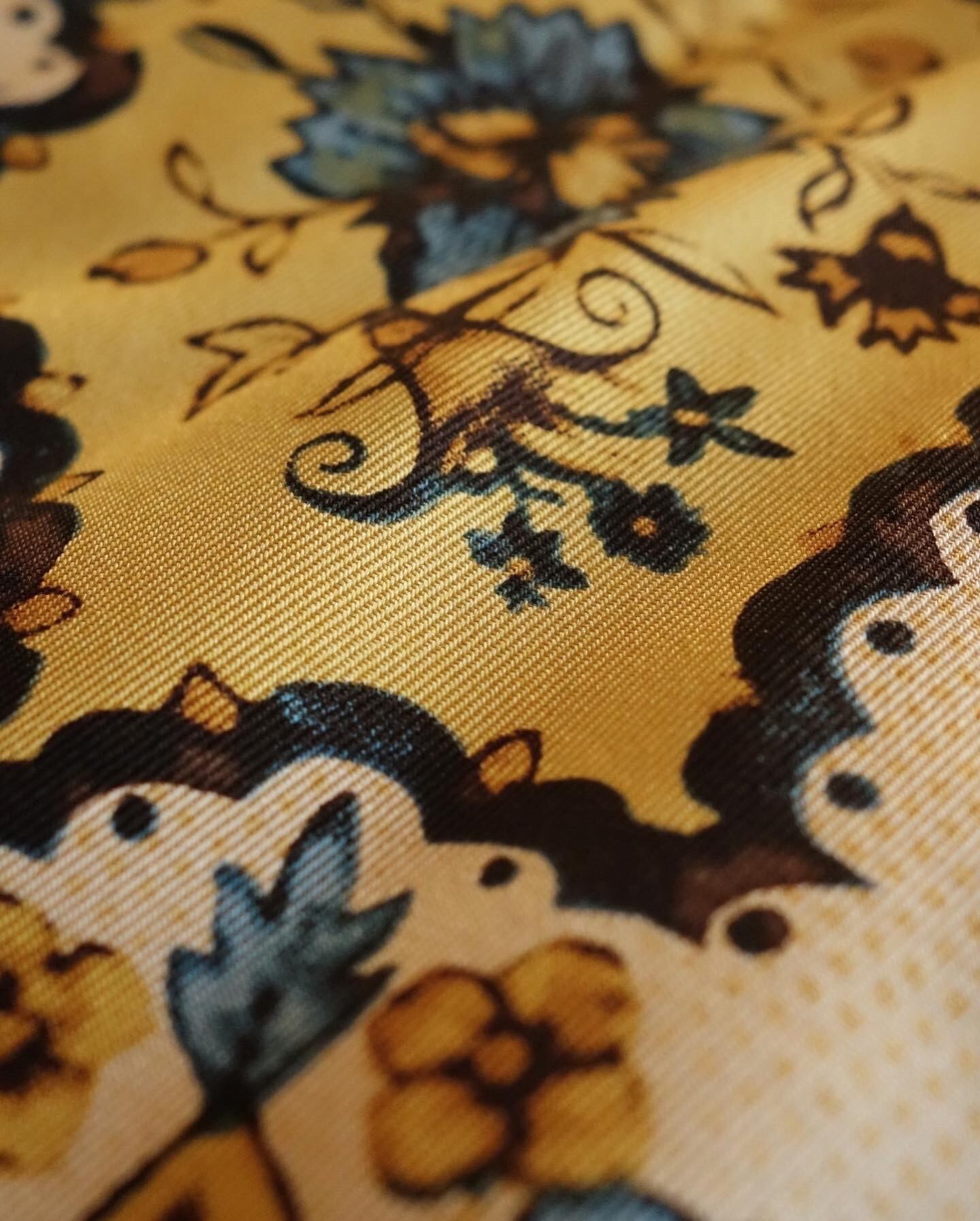 Batic =(ろうけつ染)は蝋を使った昔から親しまれてきた染色方法です。こちらのスカーフはそれをオマージュしたテキスタイルを使用したシルクのスカーフとなります。