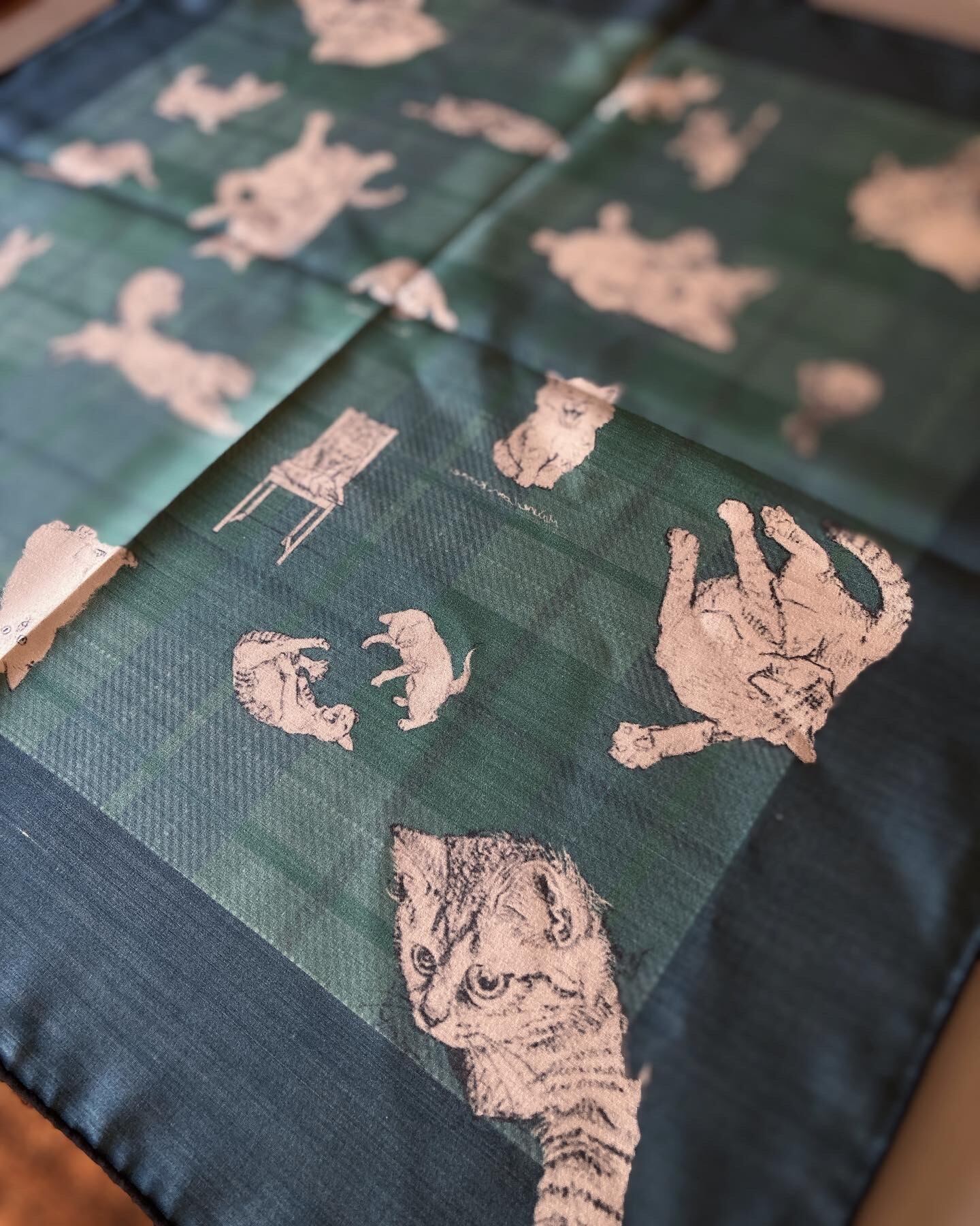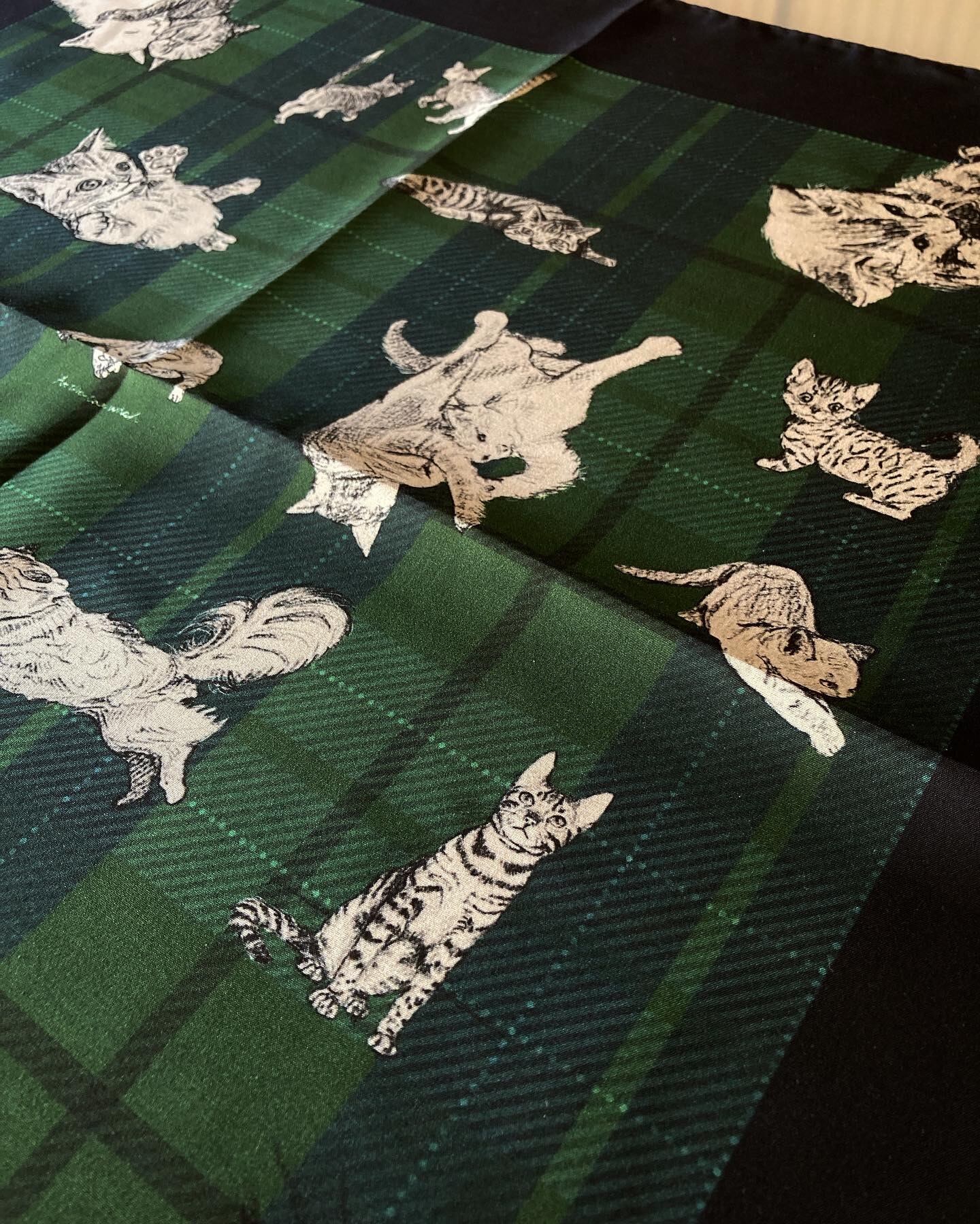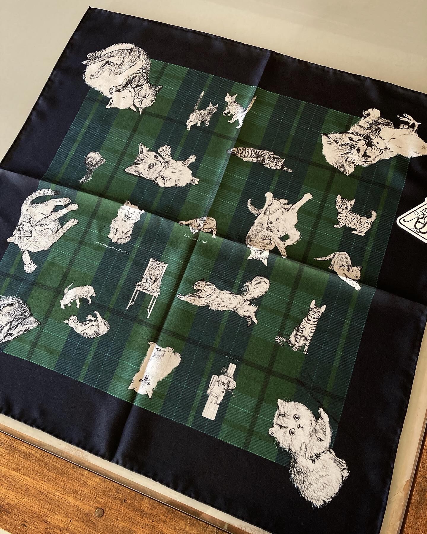 これ見よがしに愛くるしい表情満載の猫たちが、鉛筆でデッサンされた様な温かなタッチでこれはもう堪りません。また、ネイビー × グリーンのタータンチェックとイギリスの雰囲気も抜かりなくと言った具合となっております。