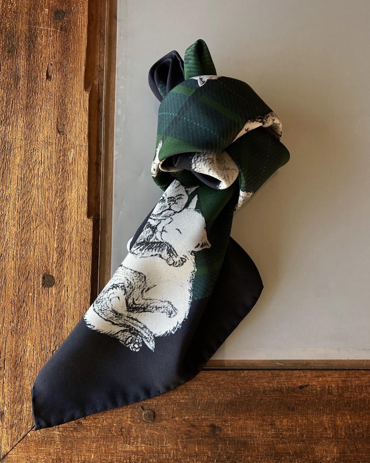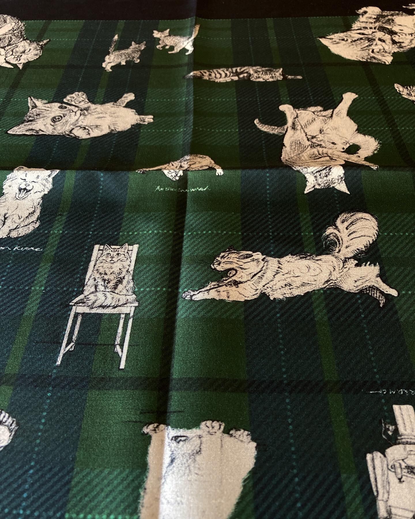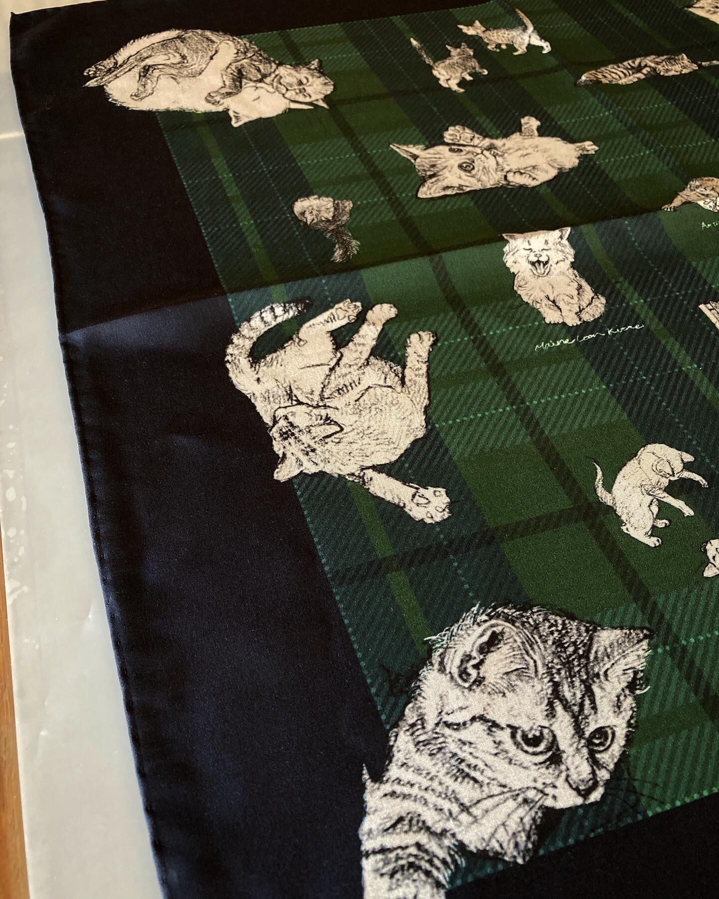 これ見よがしに愛くるしい表情満載の猫たちが、鉛筆でデッサンされた様な温かなタッチでこれはもう堪りません。また、ネイビー × グリーンのタータンチェックとイギリスの雰囲気も抜かりなくと言った具合となっております。