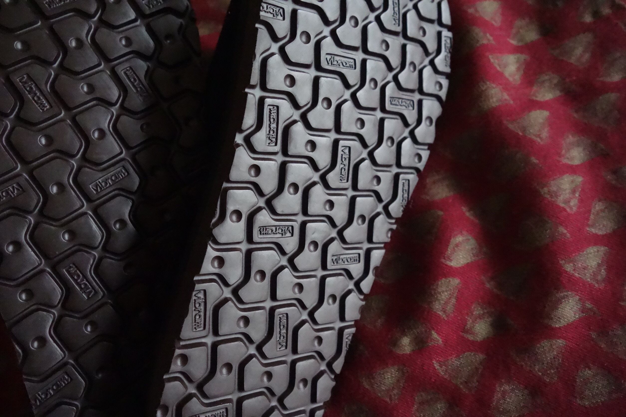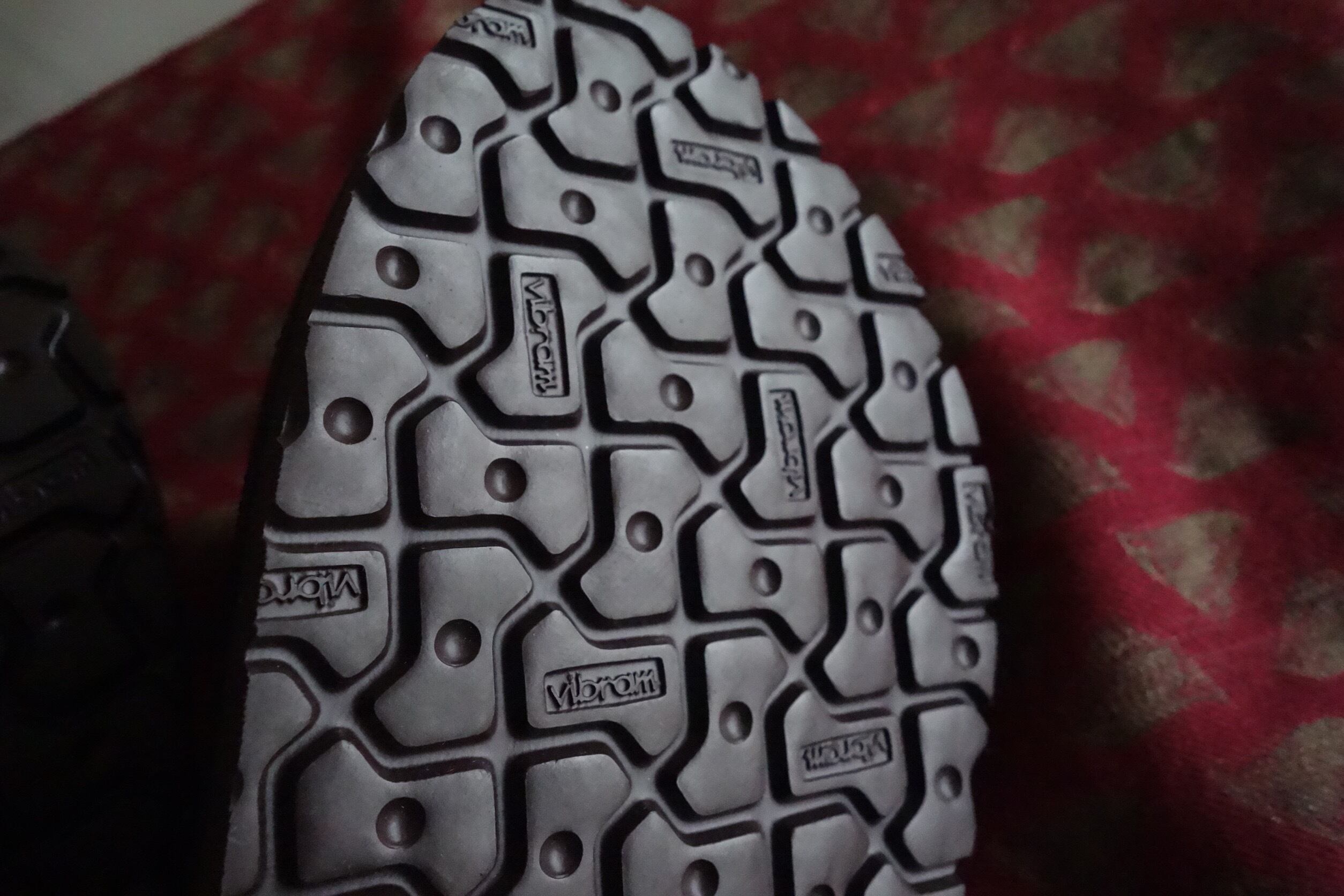 アッパーは厚口ベロア材を二枚重ねで使用しており、ソフトな足当たりが特徴です。フットベッドはショルダー部のヌメ革、履くほどに経年変化を楽しめます。アウトソールはVibram8327 WOODSTOCKを採用、EVA発泡剤と天然ゴムをベースにしたMORFLEX配合のスポンジシート。